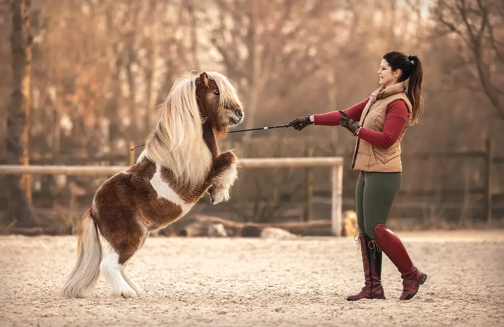 Vom „Spanischen Schritt“ über „Beine überkreuzen“ bis hin zum „Steigen“ gibt es diverse Übungen die ich dir und deinem Pferd beibringen kann. Die spielerische Arbeit am Boden bringt viele Vorteile für Pferd und Reiter mit sich.